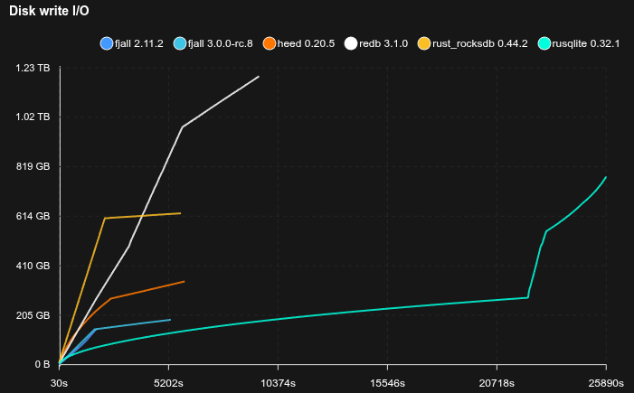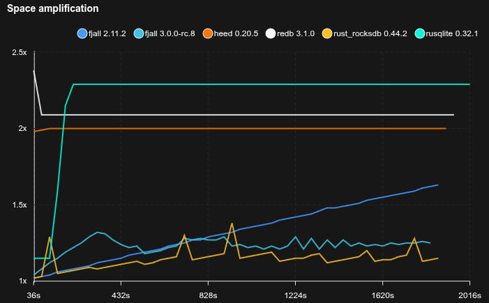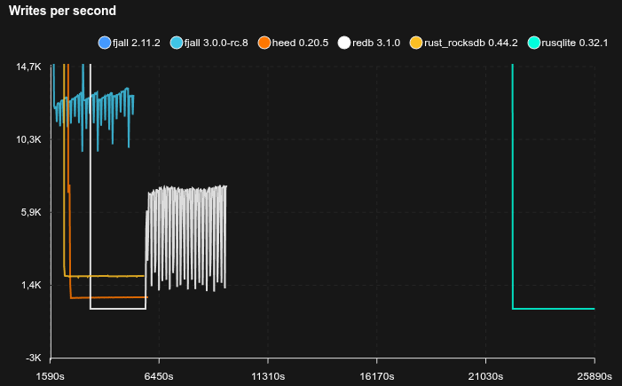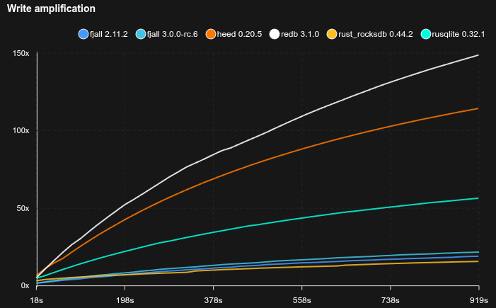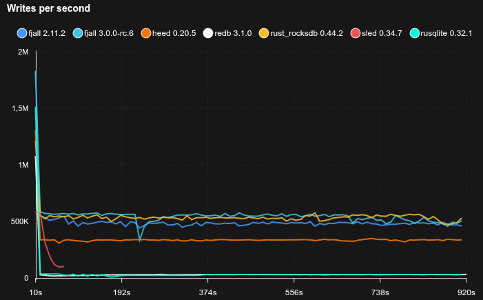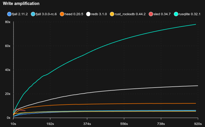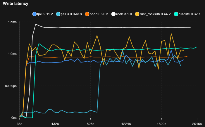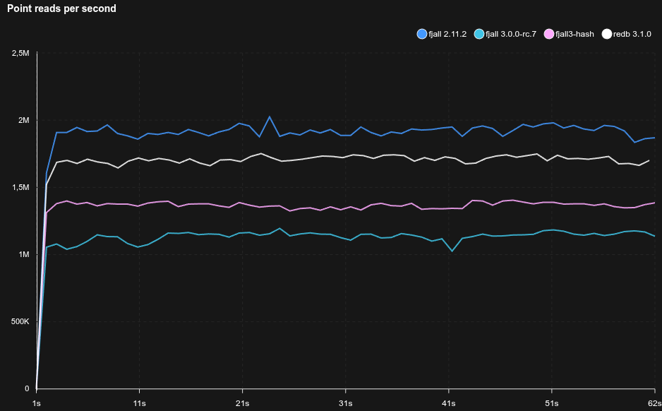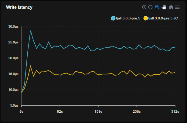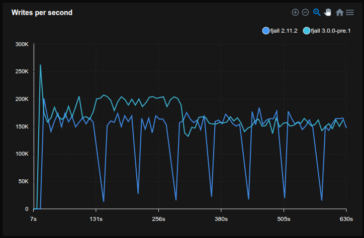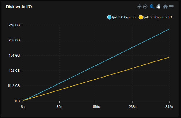 - Fjall uses key-value separation with default settings; RocksDB uses BlobDB with default settings