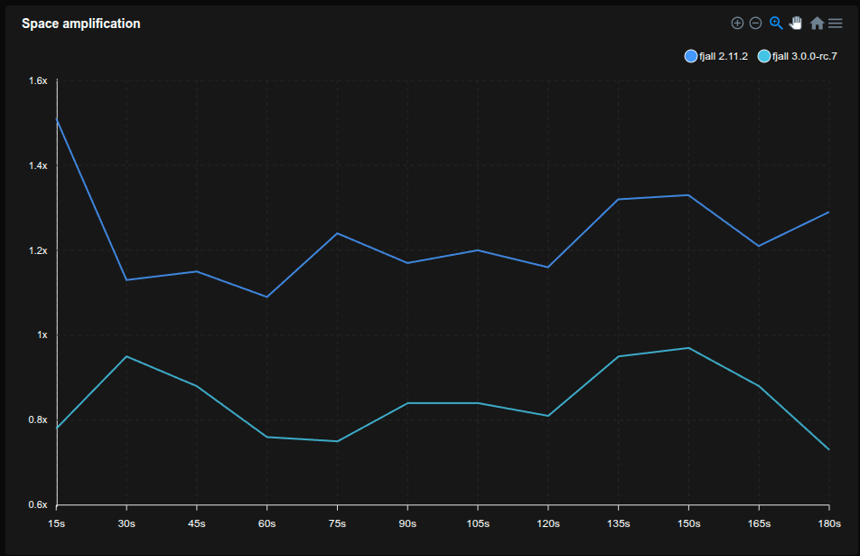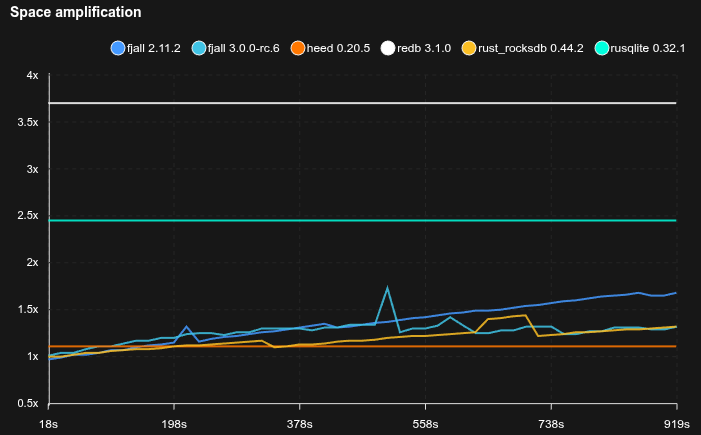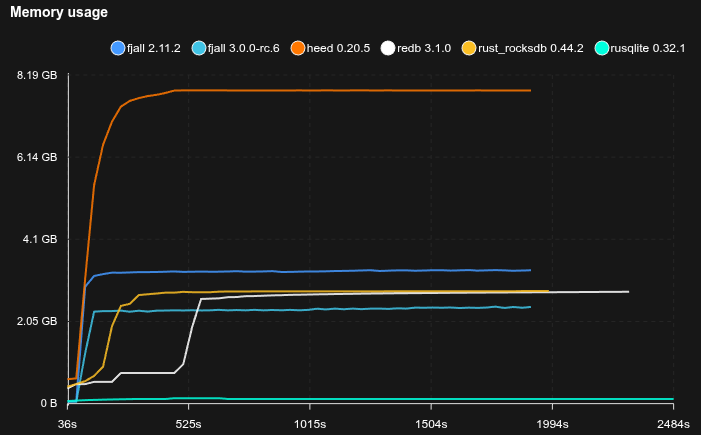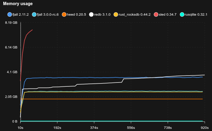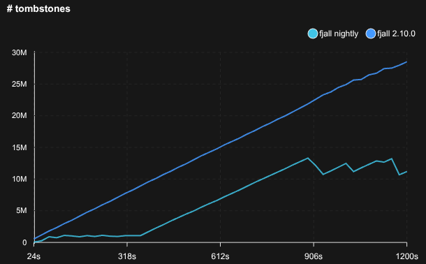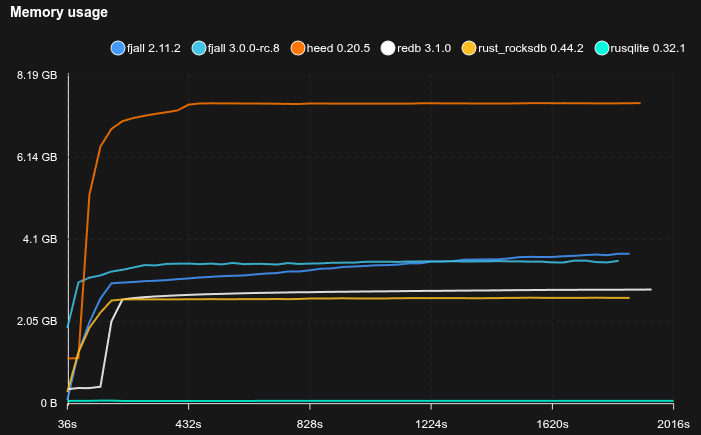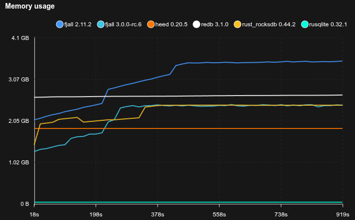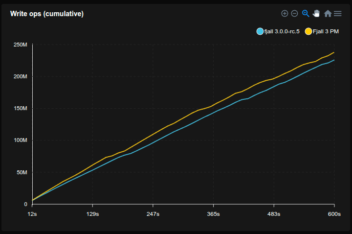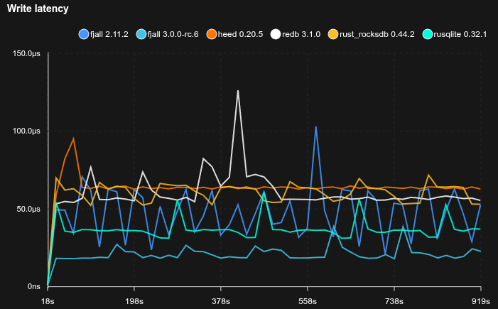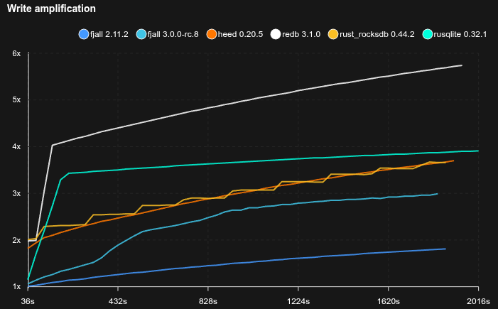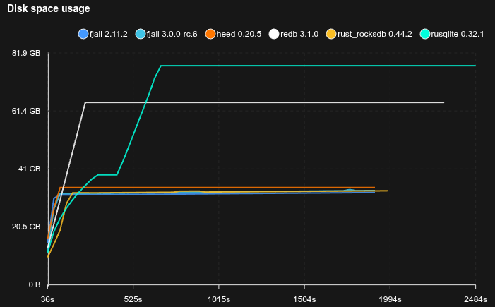 - Fjall uses key-value separation with default settings; RocksDB uses BlobDB with default settings