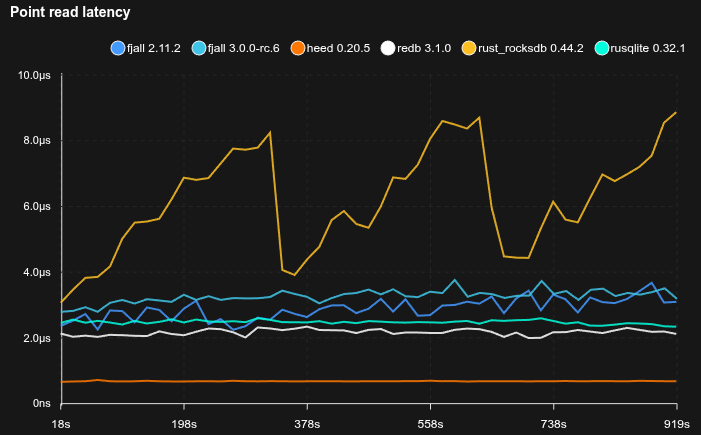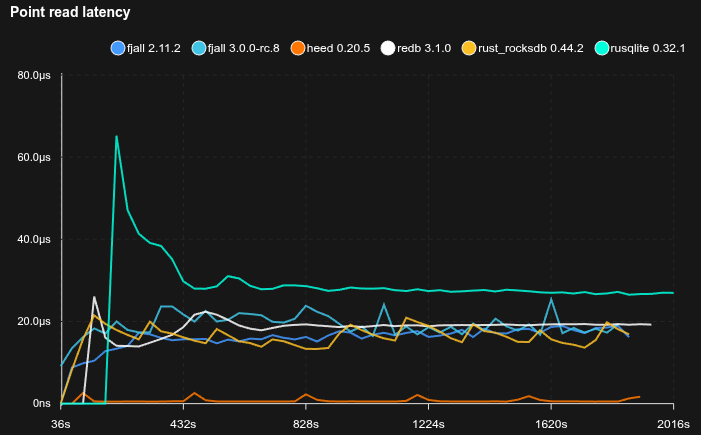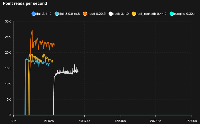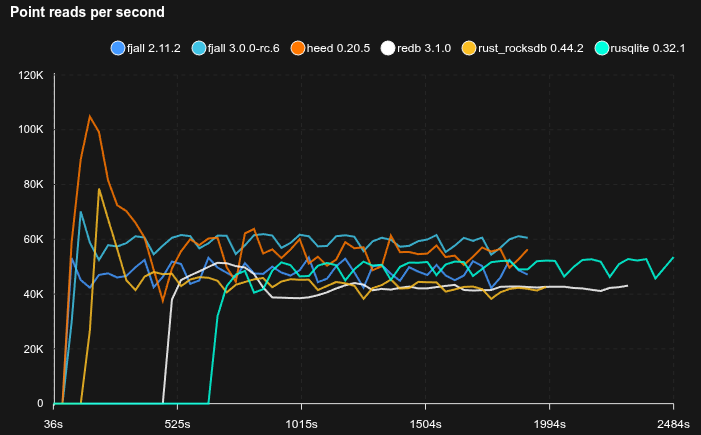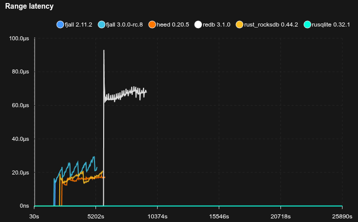 Note that this benchmarks uses 16K blocks while redb uses 4K blocks, and a less complex page format, so inherently searches are going to be slower for fjall 3.