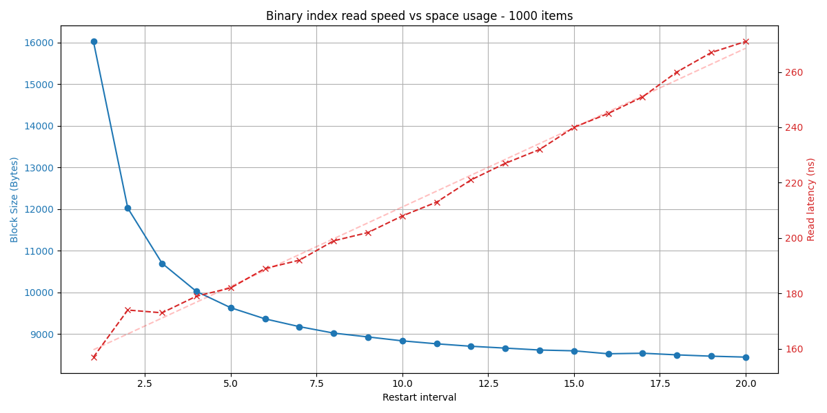When searching for a key, we perform a binary search over the binary search index. Each pointer needs to be dereferenced; the pointee’s key needs to be parsed and compared to the searched key. When the binary search finds the highest candidate restart interval (the last restart head that has a key <= searched key), it performs a linear scan to (hopefully) find the requested item.
