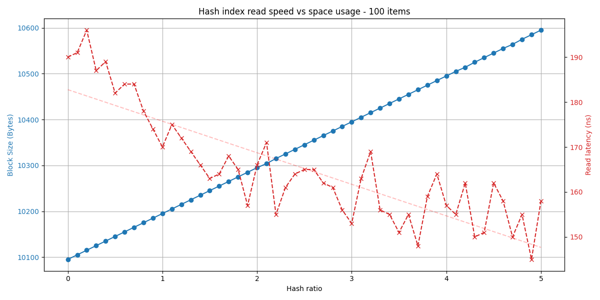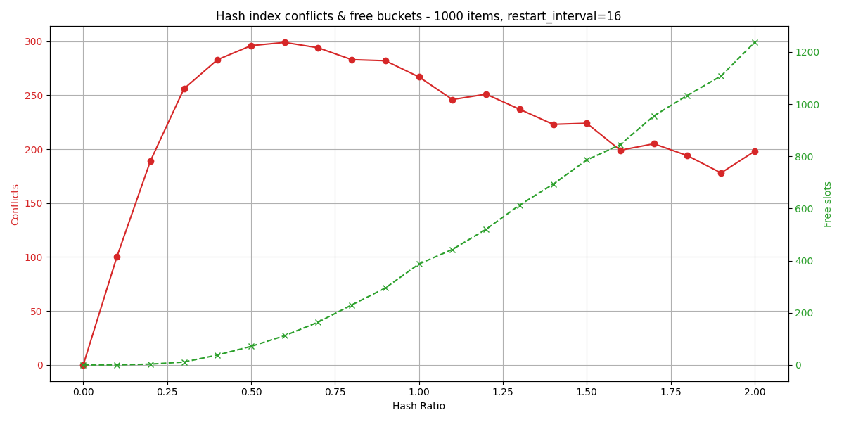 We will use the inverse of the “utilization ratio”, meaning our hash ratio is 1 / hash_util_ratio; a higher number means more bytes (and thus buckets) per key, so better read performance.